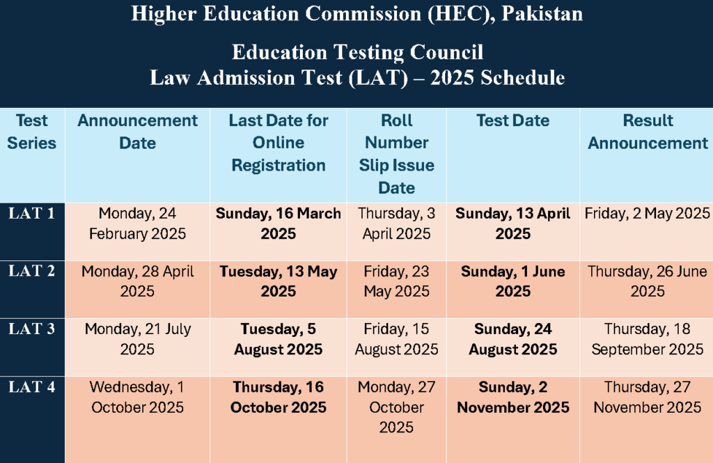 The last date to submit your Application to the Higher Education Commission (HEC) for the upcoming Law Admission Test (LAT) is 16 October 2025 and the Test shall be held on 2 November 2025